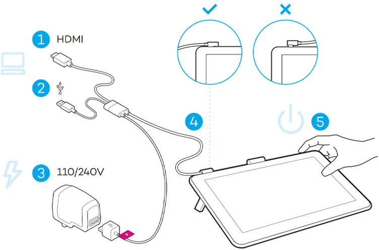 Follow these steps to connect a Wacom One to your computer. The process is similar for the old Cintiq Companion devices.