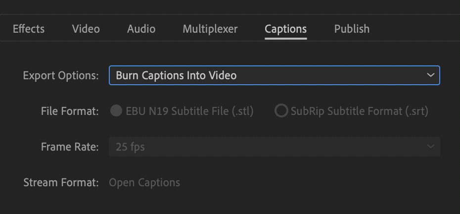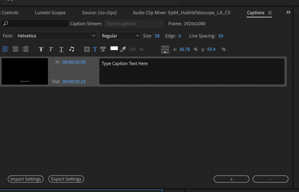 Open captions are ‘burned’ into a video, so they are added in Premiere before the final video is exported. To speed up the process you can begin by following the process laid out at the beginning of this reference guide. Make sure you have saved the “English by You” captions on OneDrive so you can easily access them.