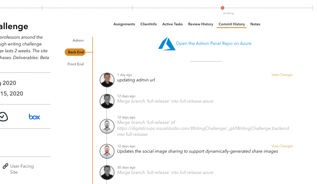 Employees simply looking to view the commit history for a project can use the Corps Dashboard’s Project Commit History feature. This method is particularly effective for JPMs who would like to stay aware of what their teammates have worked on recently.