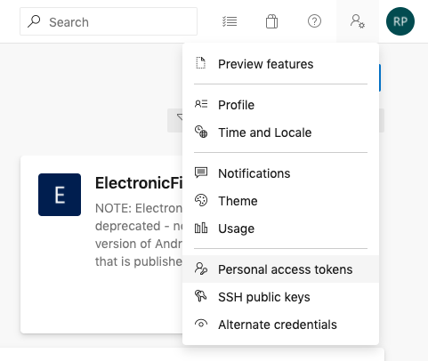 After the Dev Portal loads, click the Settings drop down in the top right corner and choose Personal access tokens. If this page fails to load, talk to a staff member.