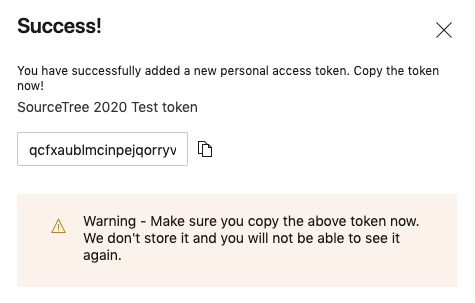 Copy the token from the next screen and store it in a safe place. This will be saved in Sourcetree in following steps, but there may be prompts for the token in the future.