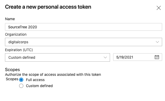 All Digital Corps development projects are stored on Microsoft’s Azure Dev Platform, a website for managing git projects (similar to Github). When Corps employees are hired, staff members will grant permissions as-needed. These permissions allow employees to clone repositories to their computers for local development purposes. Access to these repos in Sourcetree, a popular version control application, requires generation of a “token” to prevent unauthorized access.