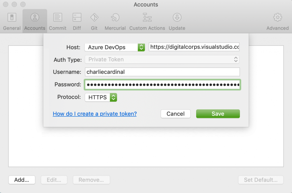 After generating an Azure Personal Access token, open Sourcetree. The following process will be similar in other git clients, including the Github app, GitKraken, etc. Use the token in place of a password for Terminal-based git commands.