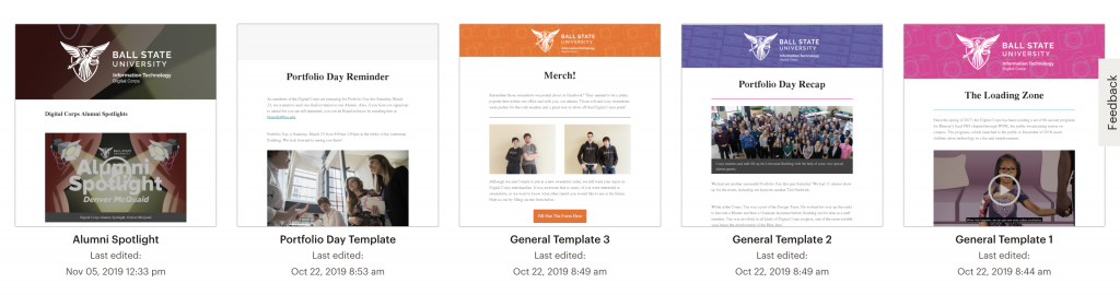 For a quicker template option, the Digital Corps has saved templates from previous email campaigns. To access these, click the Saved templates tab and choose from the options below. With a template selected, all you need to do is update the content inside the blocks.