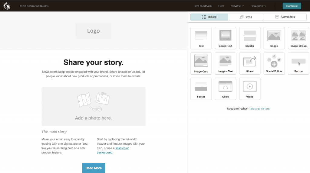 To create a template from scratch, click the Layouts tab. Then, choose one of Mailchimp’s layout options or scroll down and select a template based on the column design you want. With the layout selected, you can change how blocks are arranged and the type of content. The Style tab offers more in-depth editing options for the content blocks.