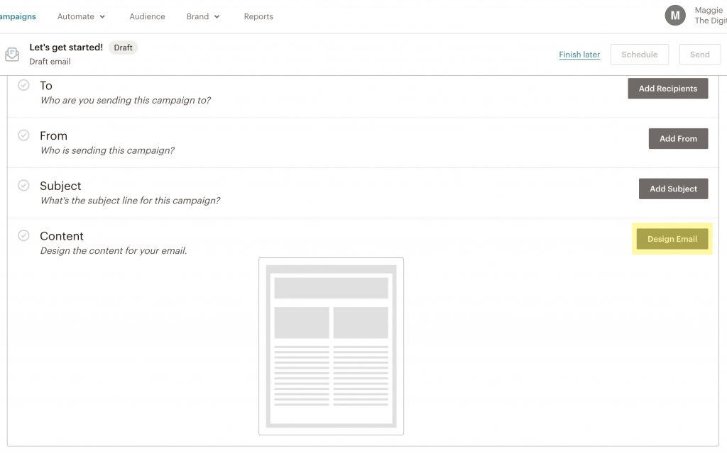 - Scroll down to the Content section of the email card and click Design Email.
