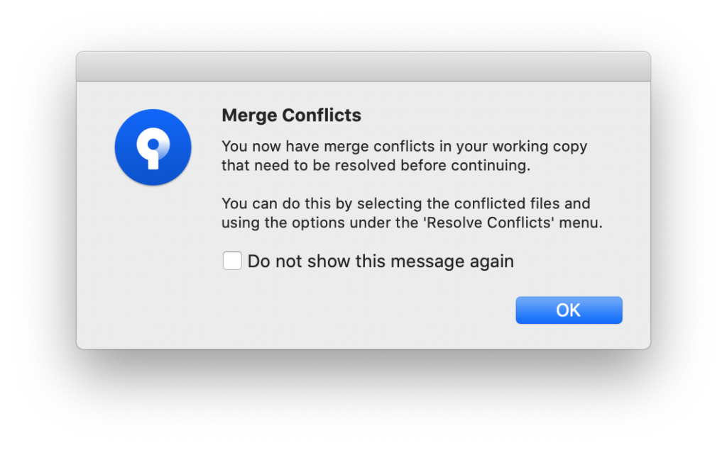 When attempting to merge conflicting branches in SourceTree, a message similar to the one below will pop up:
