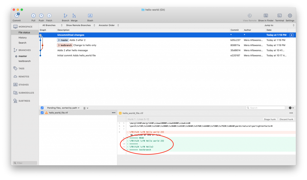 The conflicting changes are shown in the bottom right section of the window, with the conflict dividers included.