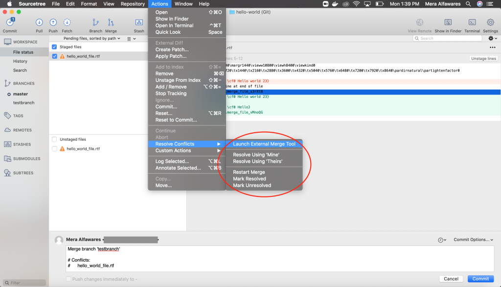 Options to resolve conflicts in SourceTree are available from the Actions option on the menu bar, under Resolve Conflicts. Launching an external editor will allow you to manually change the file. Alternatively, you could select to resolve using either ‘mine’ or ‘theirs’, which automatically keeps the content from whichever version of the file you chose.