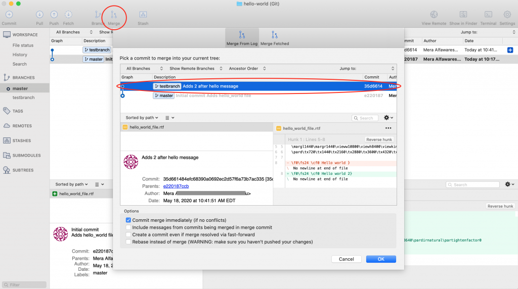 Using the Merge button, you can select a commit from other branches to merge with the current branch.