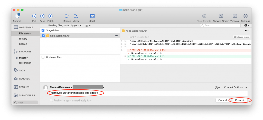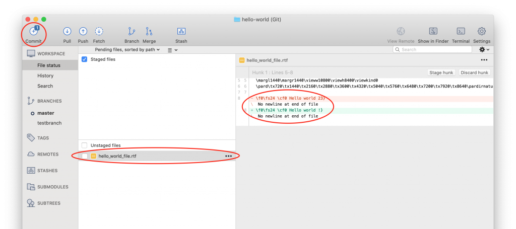 To add the file to the staging area, simply check the box to the left of the file name and it will automatically move to the staged files section. Add your commit message and click the button at the bottom right to finalize the commit.