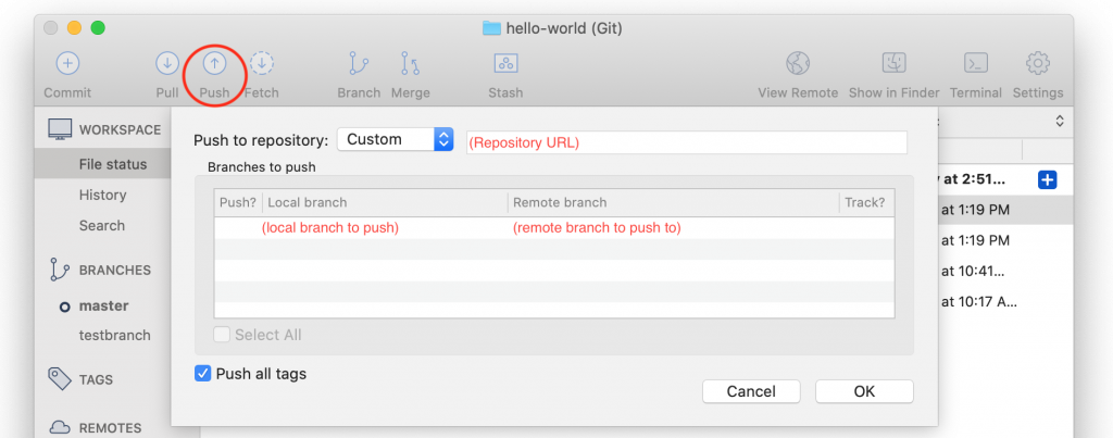 When using a remote repository, you would use Push in the toolbar, select the local branch you wish to push, and the remote branch you want to push to.