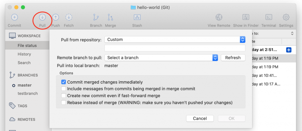 SourceTree is a desktop client that provides a graphical interface for repositories (as opposed to typing command lines in terminal). SourceTree simplifies the use of Git by providing visual displays of your local files, commit history, and branches.