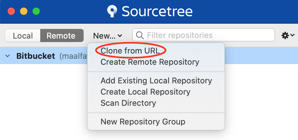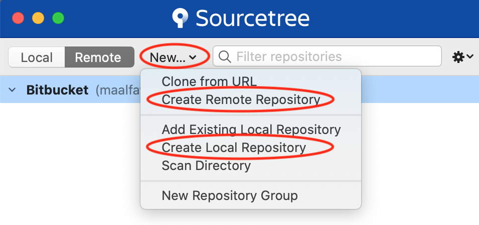 Once you’ve opened up the SourceTree application, look for a ‘New…’ button that will expand into a drop down menu. From here you can choose to create either a remote or local repository.