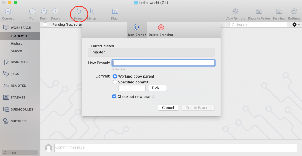 Double click on your repository from the previous window to open a new window like the one below. Use this to easily create a new branch for your repo.