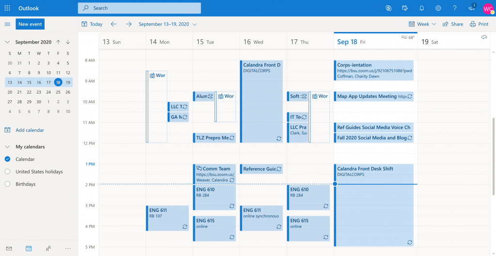 The Outlook Calendar allows students to add their class and work times. Add work hours by 8AM on the Monday of the current week, and mark class times as busy and work times as free. Make sure the calendar is set to EST, so everyone’s calendar will reflect the same time zone.