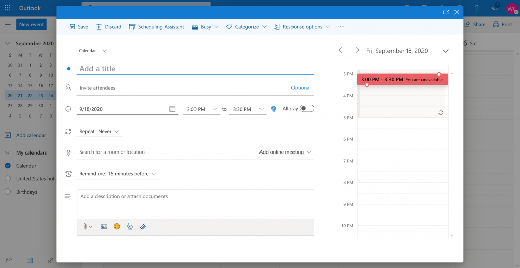 Students may need to schedule meetings with each other to work on projects, check-in, etc. To schedule a meeting, select New Event on Outlook Calendar, and then select Scheduling Assistant.