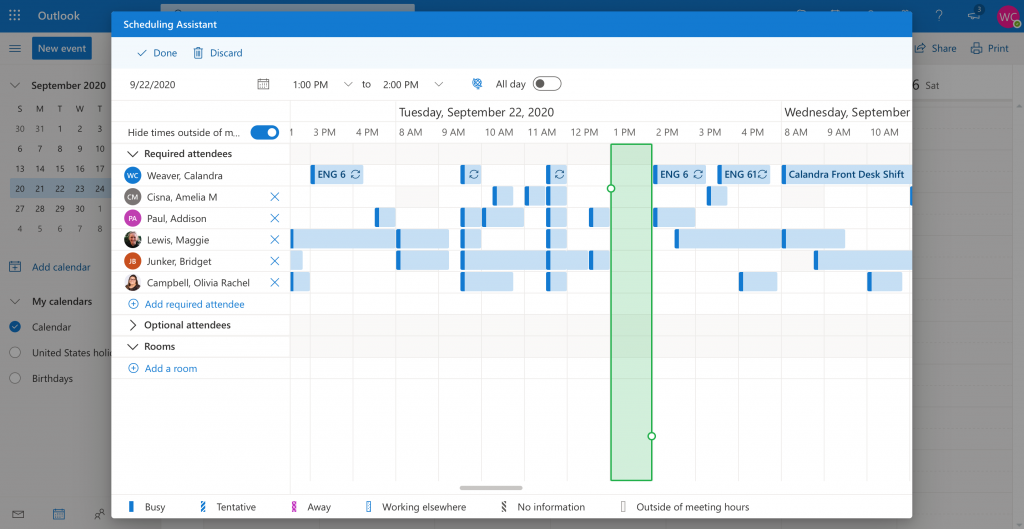 Add the required attendees email addresses to see the available times for everyone. Busy times show in blue whereas free times are blank. After choosing a time, select Done.