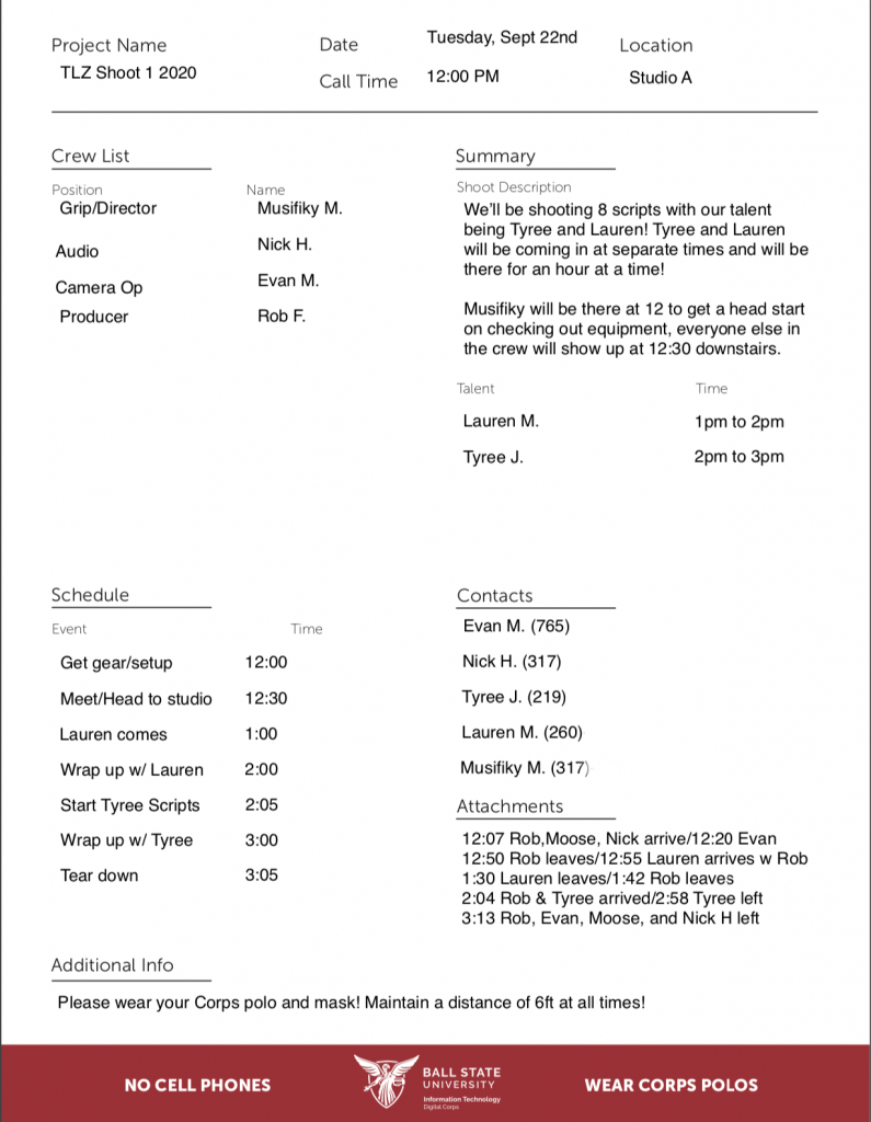 Schedule: This is where you’ll put the plan for the shoot. Here, the crew and talent know what exactly is going to happen and when it’ll happen. This is nice for talent who don’t have to be on set all day, that way they know when exactly to arrive on set.