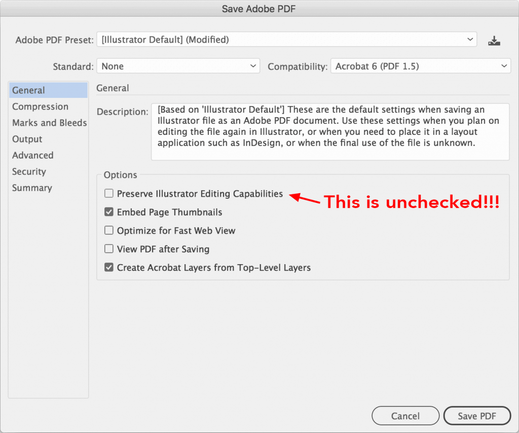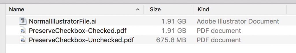If you save an Illustrator file as a PDF, make sure that you uncheck the option that says “Preserve Editing Capabilities” when it is available. This will decrease the size of the file since the review process does not require reviewers to make changes to any work.