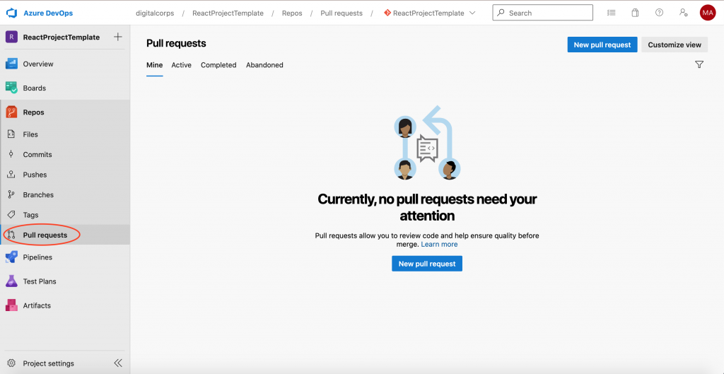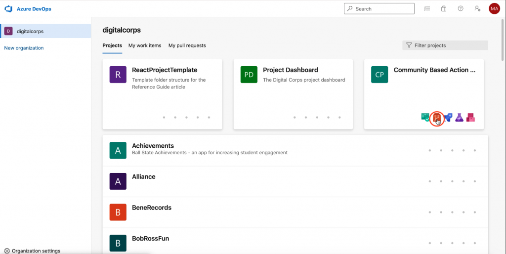 Digital Corps repositories can be found at the Azure DevOps dashboard. Navigate to your project’s repository on the dashboard.