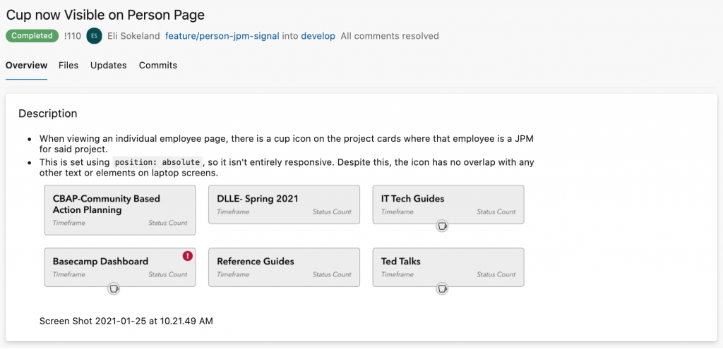 At the Digital Corps, pull requests are used as the review process for the development team. All project work needs to be reviewed and pull requests establish a streamlined feedback loop for development projects.