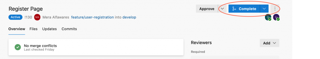 If it has been approved, and there are no merge conflicts, you can proceed with the merge by clicking the blue Complete button at the top right corner of your pull request page.