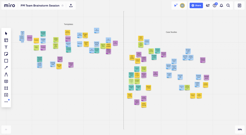 You can conduct a Saturate and Group session remotely as well. The overall process is the same, but instead of sticky notes and a whiteboard, you will use a video conferencing platform like Zoom and collaboration tools like Miro or Whimsical. For online tools, incorporate a quick introduction to the tools at the beginning of your session to ensure all participants feel comfortable using them. In a remote session, it may be tempting for participants to help group the sticky notes during the group part of the session. Make sure that as the proctor, you are the only one grouping them so discussions can still occur.